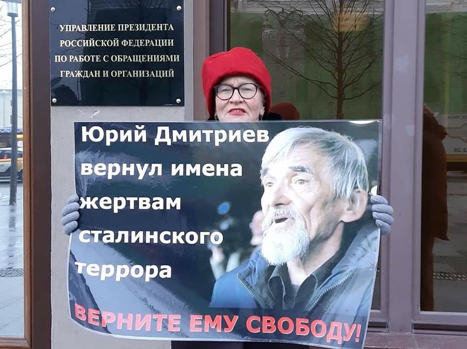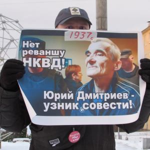 (It reads, “No to the resurgencwe of the NKVD! Yury Dmitriev is a prisoner of conscience!”)