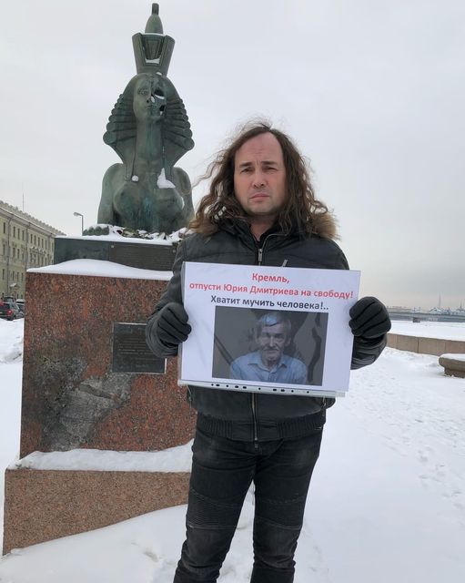 Daniel Kotsubinsky‘s placard reads, “Let Yury Dmitriev go, Kremlin! You’ve tormented him enough!”