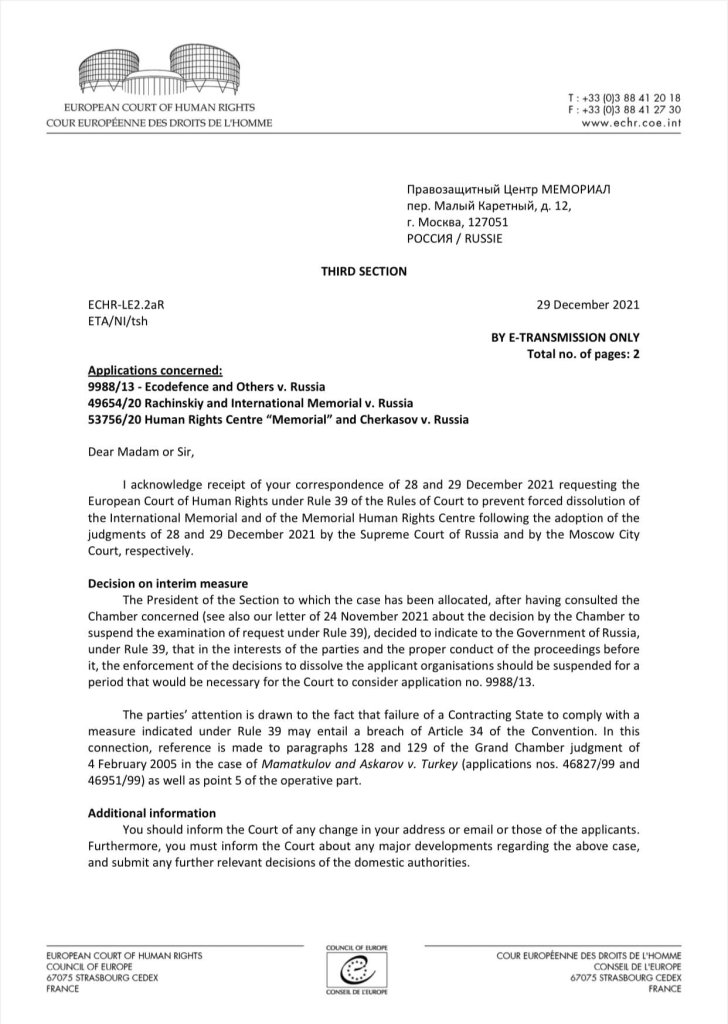 Meanwhile, the European Court in Strasbourg issued an “interim measure” on 29 December 2021 (see text below).