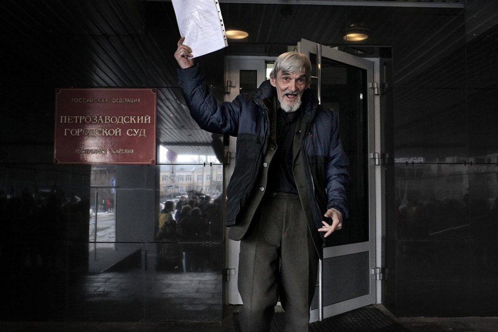 Yury Dmitriev holds up the text of his acquittal (Photo, Anna Artemyeva / Novaya gazeta)